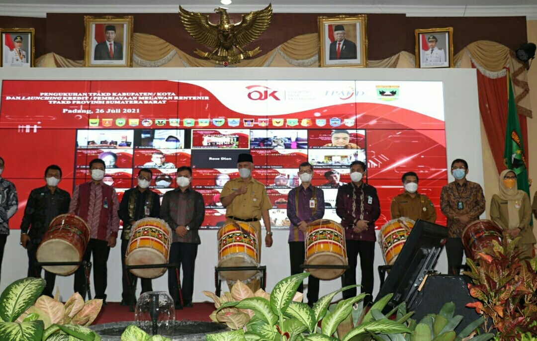 Gubernur Mahyeldi, Senin (26/7/2021) mengukuhkan Tim Percepatan Akses Keuangan Daerah (TPAKD) 18 kabupaten dan kota se Sumbar, di Auditorium Gubernuran.