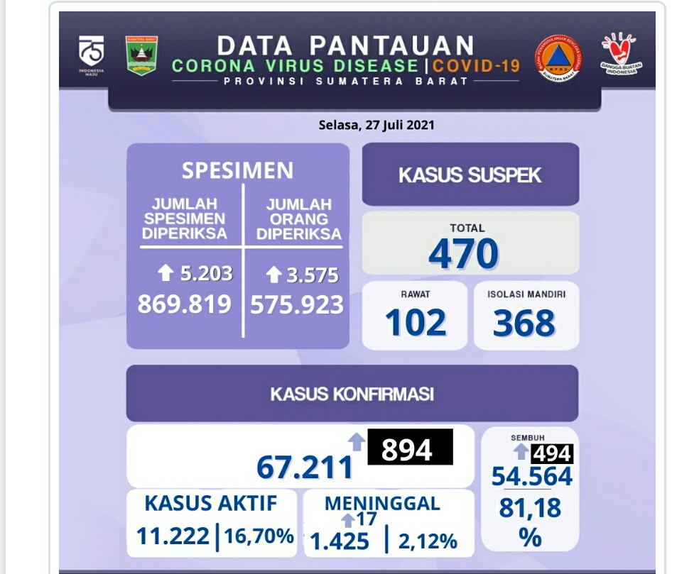 IWOSUMBAR.COM, PADANG – Satgas Covid-19 Sumbar Jasman Rizal mencatat total sampai hari Selasa (27/7/2021) telah 67.211 orang warga Sumbar terkonfirmasi positif. Terjadi penambahan kasus sebanyak 894 terkonfirmasi.