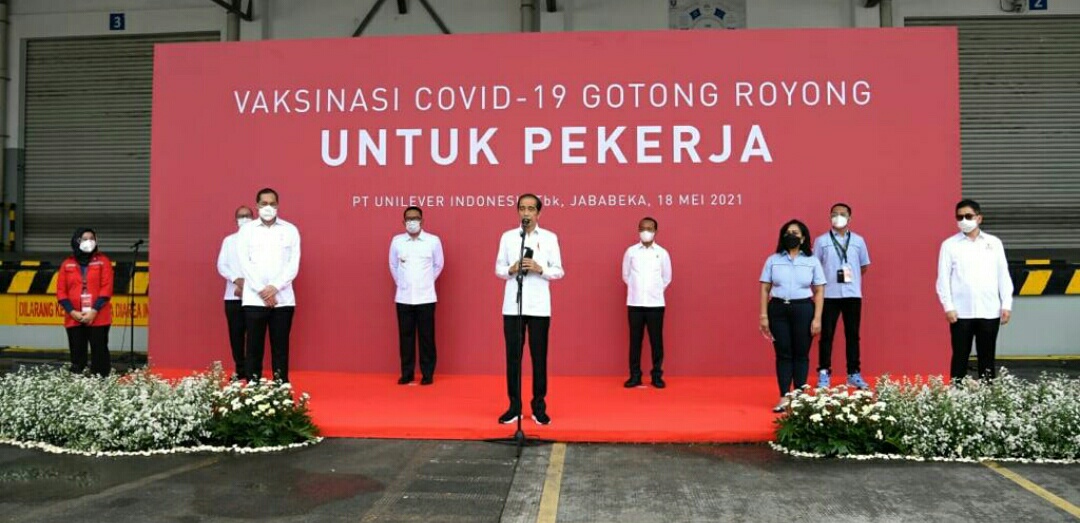 IWOSUMBAR.COM, JAKARTA – Presiden Joko Widodo meninjau pelaksanaan perdana program Vaksinasi Covid-19 Gotong Royong yang dipusatkan di pabrik PT Unilever Indonesia, Kawasan Industri Jababeka, Cikarang, Kabupaten Bekasi, Jawa Barat, pada Selasa, 18 Mei 2021.