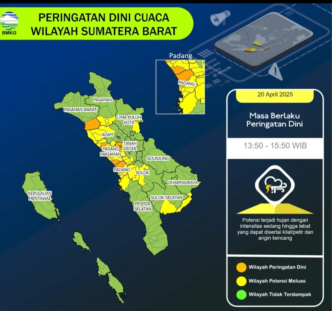 IWOSUMBAR.COM, PADANG- Badan Meteorologi, Klimatologi, dan Geofisika (BMKG) Sumatera Barat mengeluarkan peringatan dini cuaca ekstrem pada hari Minggu, 20 April 2025, pukul 13.40 WIB.