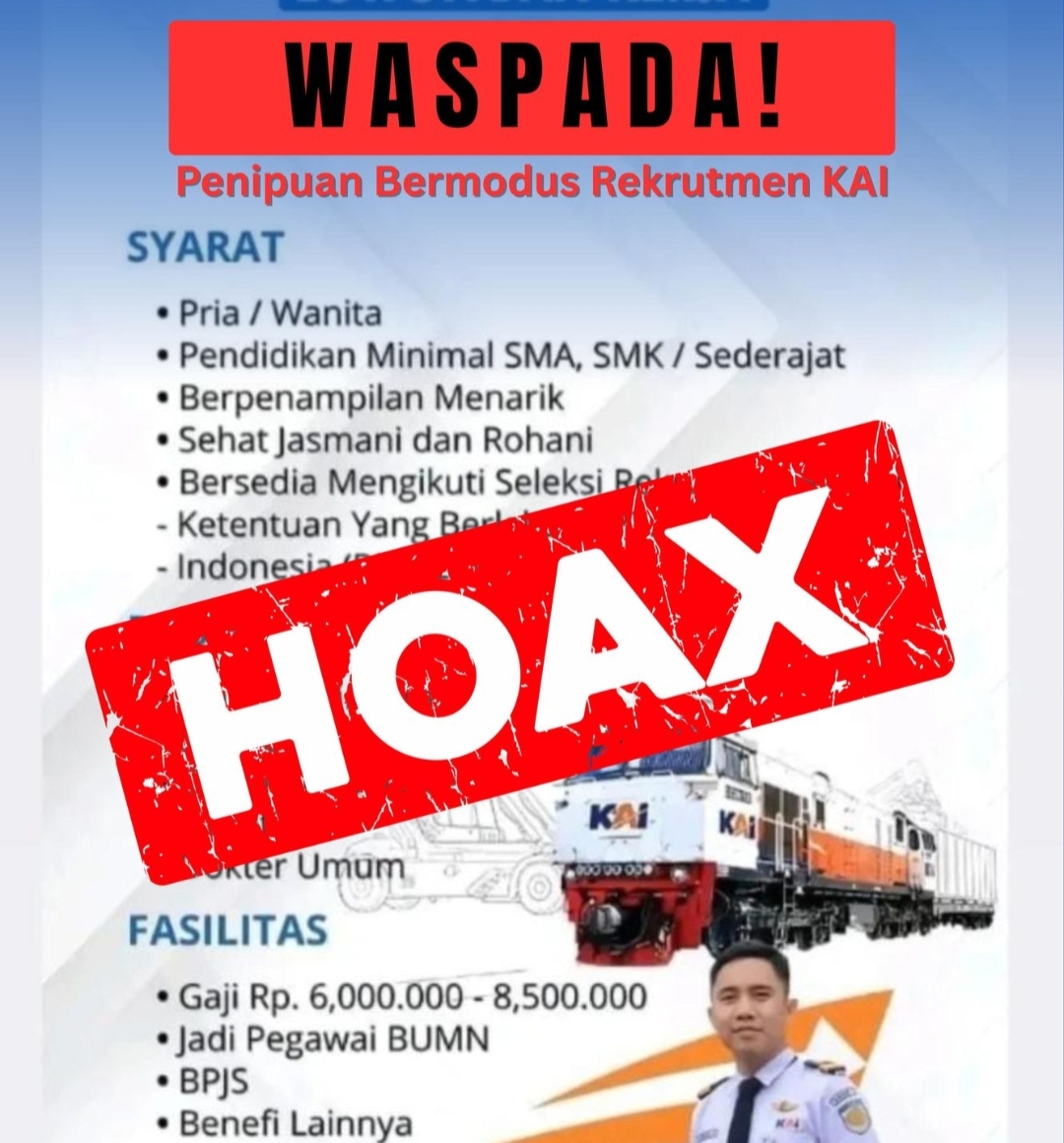 Reza menyampaikan informasi rekrutmen KAI sepenuhnya menggunakan website resmi dengan alamat e-recruitment.kai.id dan media sosial resmi perusahaan @keretaapikita atau @kai121. Jika menemukan info rekrutmen yang tidak bersumber dari situs tersebut, agar masyarakat mengabaikan.