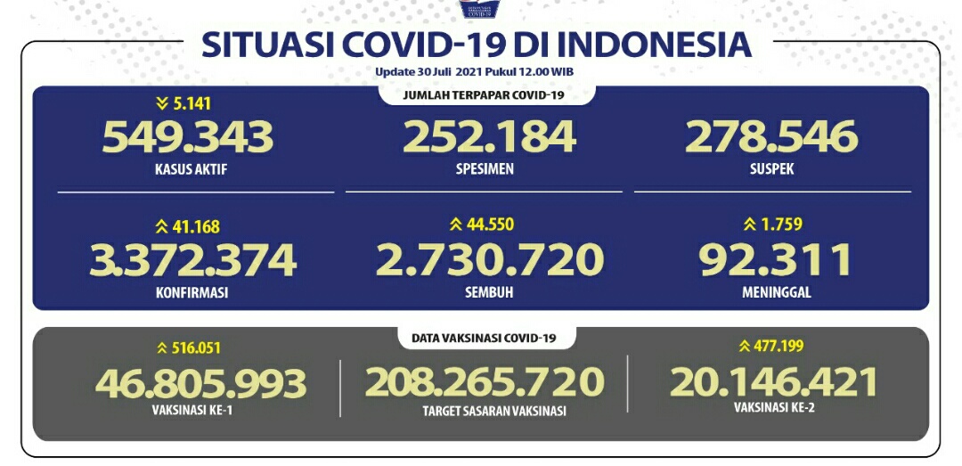 IWOSUMBAR.COM, JAKARTA – Perkembangan penanganan pandemi Covid-19 per 30 Juli 2021 tercatat pertambahan pasien sembuh hari ini sebanyak 44. 550 kasus