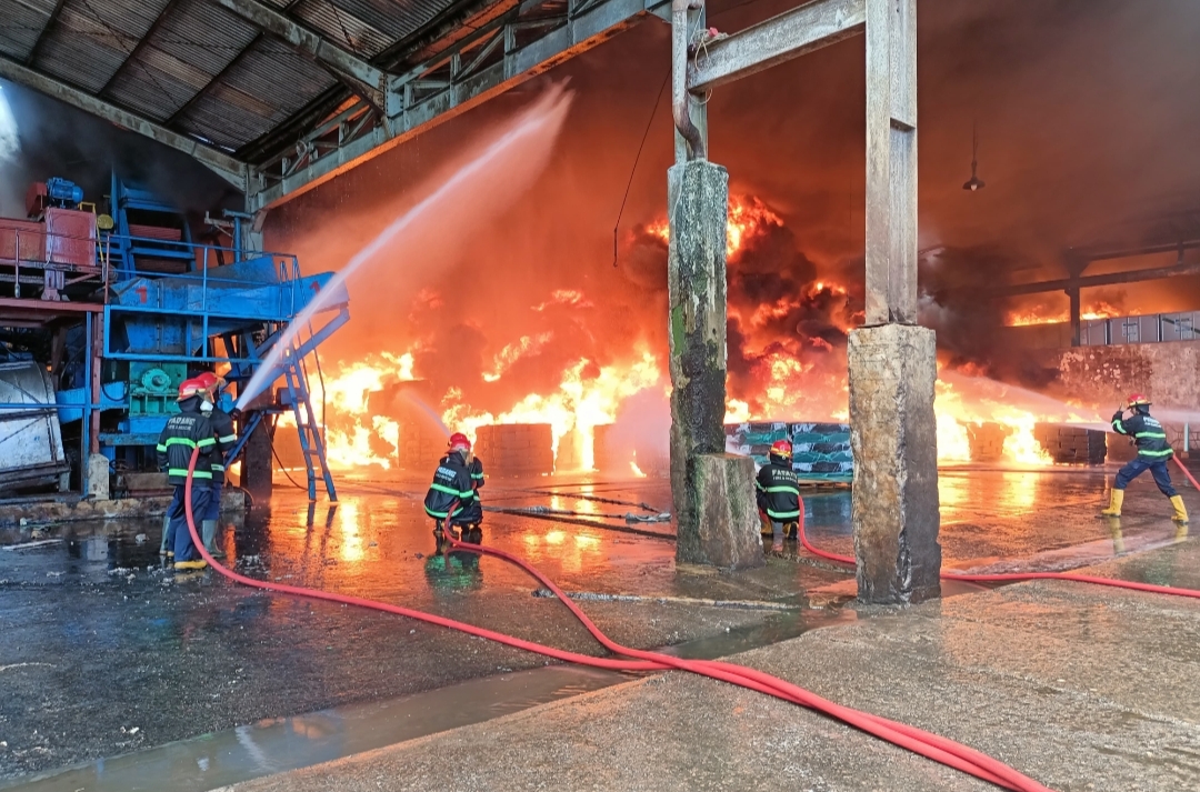 Balasan unit pemadam kebakaran telah dikerahkan ke lokasi, dan petugas tampak berjibaku memadamkan api di dalam area pabrik.