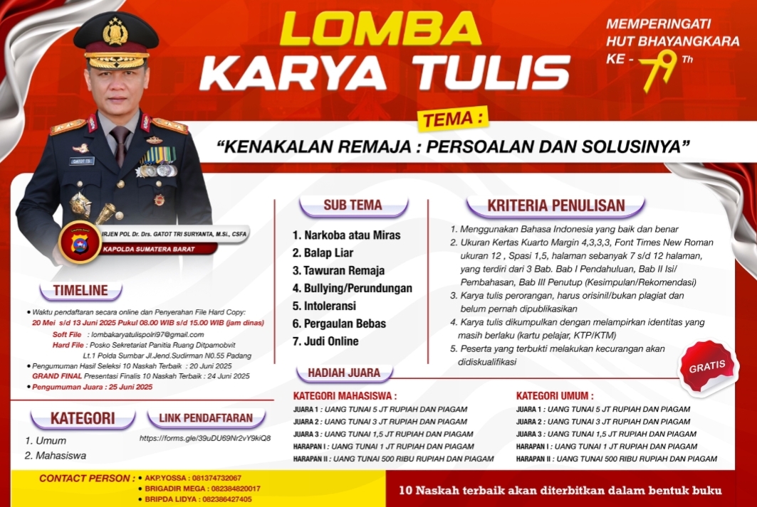 Kegiatan ini digelar dalam rangka memperingati Hari Bhayangkara ke-79, dan menyasar pelajar serta kaum muda di seluruh Sumatera Barat yang ingin menyalurkan ide-ide segar dan inspiratif melalui tulisan.