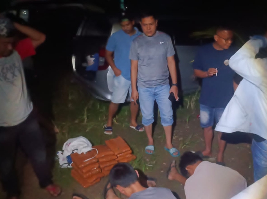 Dalam penggeledahan yang disaksikan warga setempat, polisi menemukan 16 paket besar ganja yang dibungkus lakban kuning dan disimpan dalam karung goni putih di dalam mobil Daihatsu warna silver.