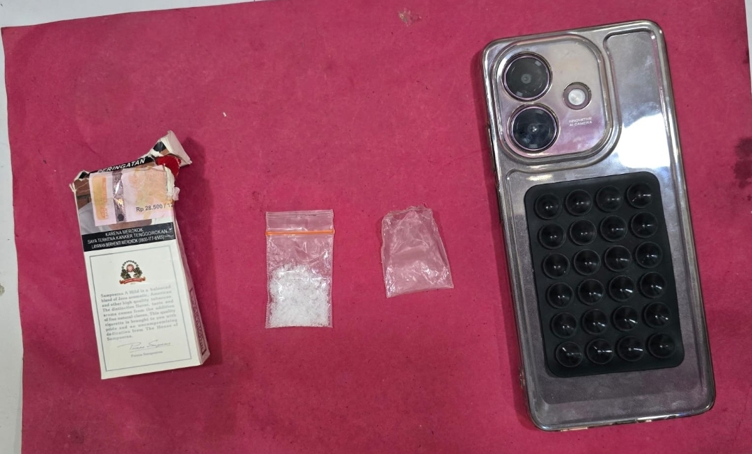 Dari hasil penggeledahan, polisi menemukan satu plastik klip bening berisi butiran kristal yang diduga sabu, satu plastik kosong, satu bungkus rokok, dan satu unit handphone merek Oppo warna hitam.