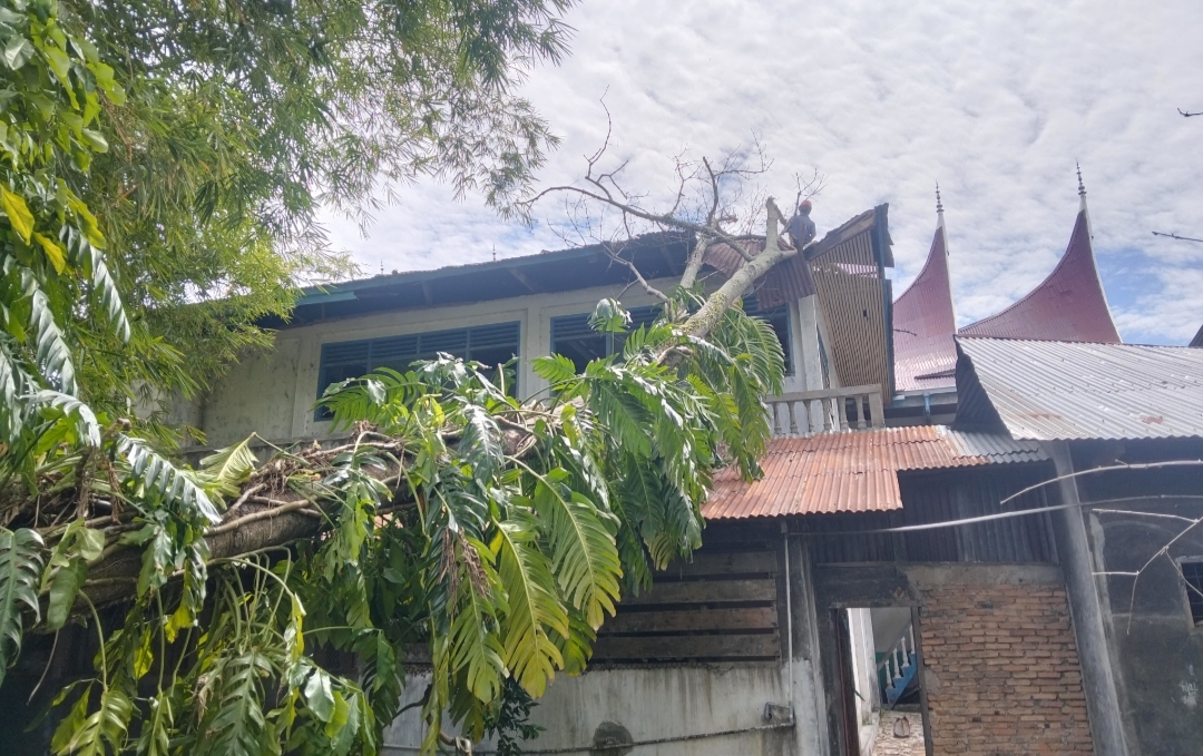 IWOSUMBAR.COM, PADANG- Sebuah pohon besar jenis jariang tumbang dan menimpa bangunan Panti Asuhan Muhammadiyah Cabang Pauh IX Rawang Ketaping di Jalan Dr. M. Hatta, Kota Padang, Minggu (29/6/2025).