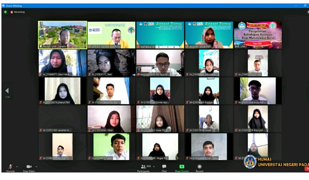 IWOSUMBAR.COM, Padang-Program Pengenalan Kehidupan Kampus bagiMahasiswa Baru (PKKMB) jalur masuk Seleksi Nasional Masuk Perguruan Tinggi (SNMPTN) di Lingkungan Universitas Negeri Padang (UNP) dilakukan secara daring. Pengenalan dibuka oleh Rektor UNP, pada Senin/ (2/8).