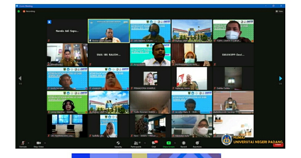 IWOSUMBAR.COM, Padang – Musyawarah Guru Teknologi Informasi dan Komunikasi (MG-TIK) SMA/SMK bekerjasama dengan Jurnal Vokasi Informatika (JAVIT) Universitas Negeri Padang (UNP) selenggarakan Wokrshop Pembuatan KTI dan Jurnal Ber-ISSN secara daring melalui zoom meeting Selasa 3 Agustus 2021.