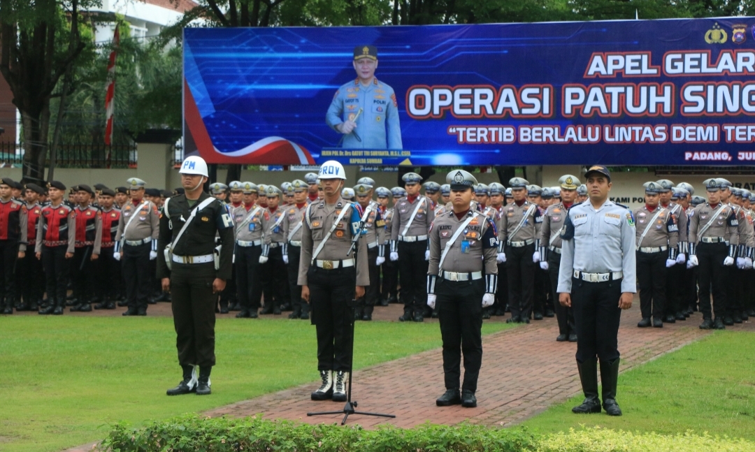 IWOSUMBAR.COM, PADANG- Kepolisian Daerah Sumatera Barat (Polda Sumbar) resmi menggelar Operasi Patuh Singgalang 2025 Senin (14/7). Pada apel yang dipimpin Kepala Biro Operasi (Karo Ops) Polda Sumbar, Kombes M. Erwin, dihadiri sejumlah pejabat utama Polda, personel TNI Denpom Padang, serta pasukan gabungan.