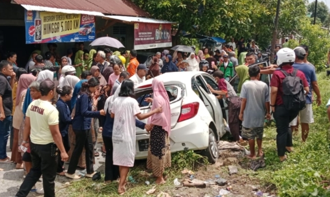 “Mobil sudah hampir melewati rel, tapi kereta datang kencang dari arah Simpang Aru dan langsung menghantam bagian samping,” ujarnya.