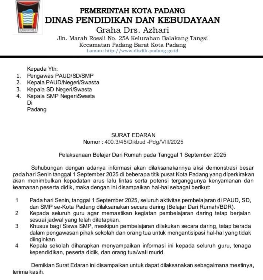 Surat edaran bernomor 400.3/45/Dikbud-Pdg/VIII/2025 itu ditandatangani langsung oleh Kepala Disdikbud Kota Padang pada 31 Agustus 2025.