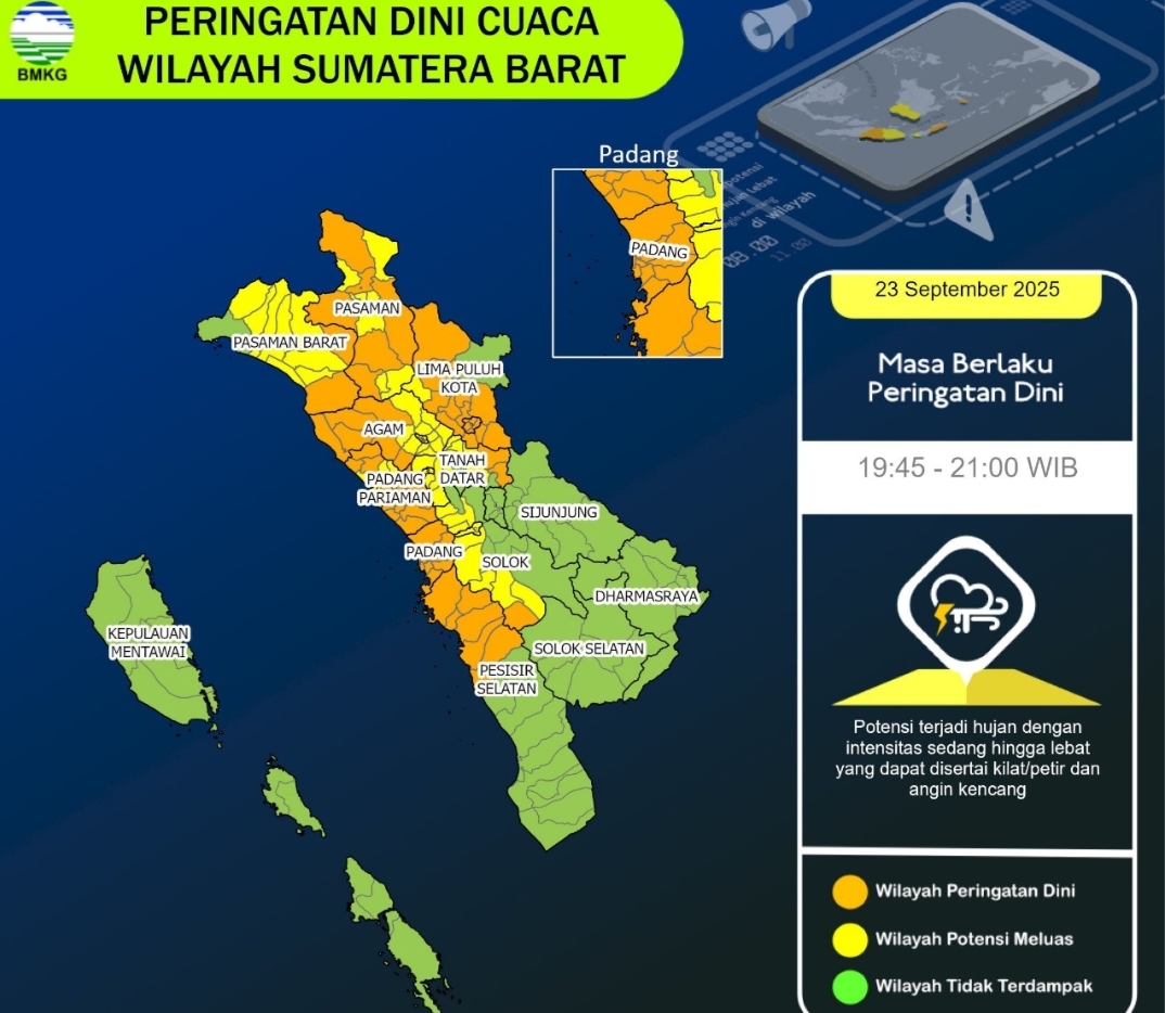 IWOSUMBAR.COM, PADANG- Badan Meteorologi, Klimatologi, dan Geofisika (BMKG) mengeluarkan peringatan dini cuaca untuk wilayah Sumatera Barat pada Selasa (23/9/2025) malam. Pada pukul 19.33 WIB, BMKG mencatat masih berpotensi terjadi hujan dengan intensitas sedang hingga lebat yang dapat disertai kilat/petir dan angin kencang.