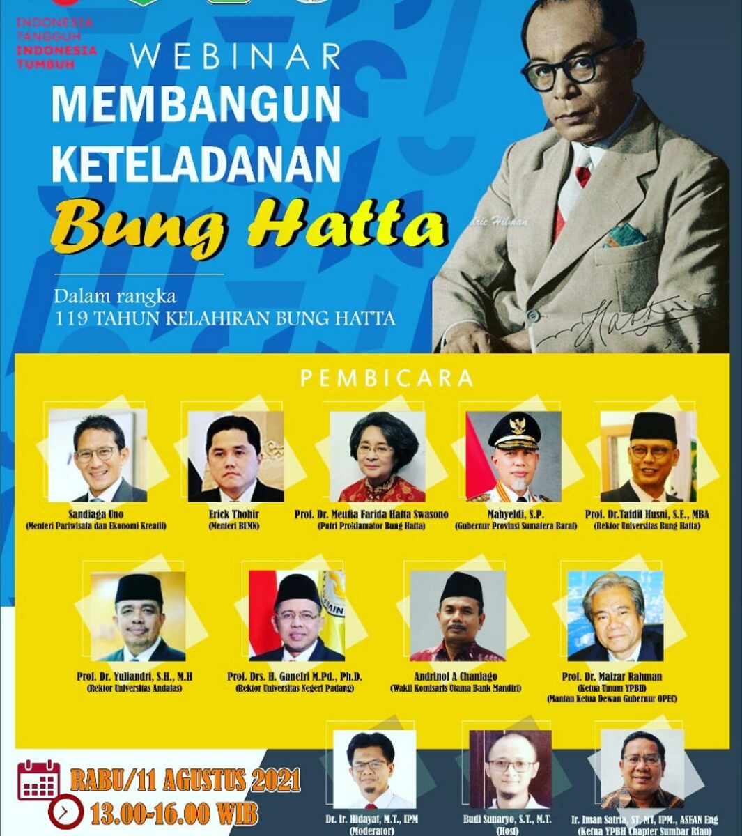 Tahun 2021 ini, Universitas Bung Hatta bekerjasama dengan Pemerintah Propinsi Sumatera Barat dan Yayasan Proklamator Bung Hatta, akan menggelar Webinar dengan mengangkat tema “Membangun Keteladanan Bung Hatta”