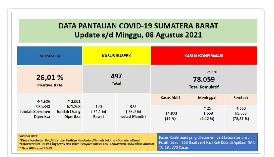 IWOSUMBAR.COM, PADANG – Satgas Penanganan Covid-19 Sumbar melaporkan total sampai hari ini Minggu (8/8/2021) total kamulatif kasus Corona telah berjumlah 78.059 kasus.