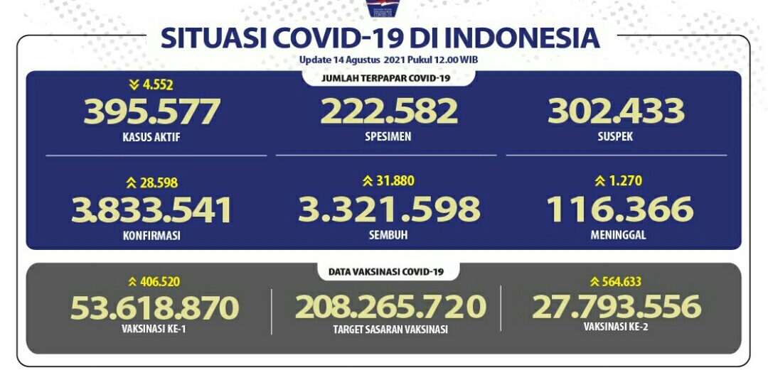 IWOSUMBAR.COM, JAKARTA – Perkembangan penanganan pandemi Covid-19 per 14 Agustus 2021 tercatat pertambahan pasien sembuh hari ini sebanyak 31.880 kasus