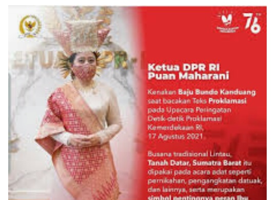 Diketahui, Busana adat Minang yang dikenakan oleh Puan Maharani saat membaca teks Pancasila adalah pakaian tradisional dari Lintau Tanah Datar yang acap dikenakan pada acara penting seperti pernikahan dan pengangkatan seorang Datuak.