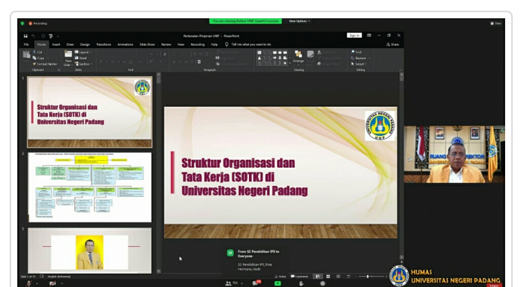 IWOSUMBAR.COM, Padang– Kegiatan Orientasi Mahasiswa Baru Pascasarjana (Jenjang S-2/S-3) di lingkungan Universitas Negeri Padang (UNP), diselenggarakan melalui Virtual Meeting, Jumat/ 20 Agustus 2021.