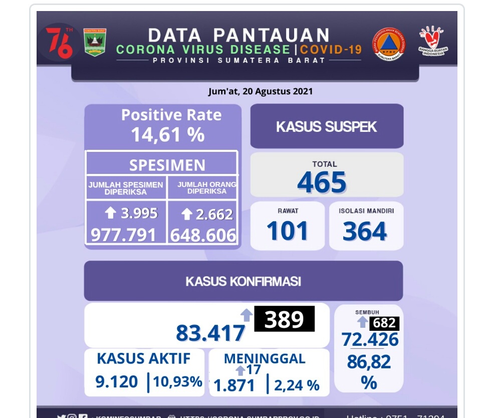 IWOSUMBAR.COM, PADANG – Satgas Penanganan Covid-19 Sumatera Barat melaporkan secara kamulatif hari ini Jumat (20/8/2021) warga terkonfirmasi telah berjumlah 83.417 kasus.