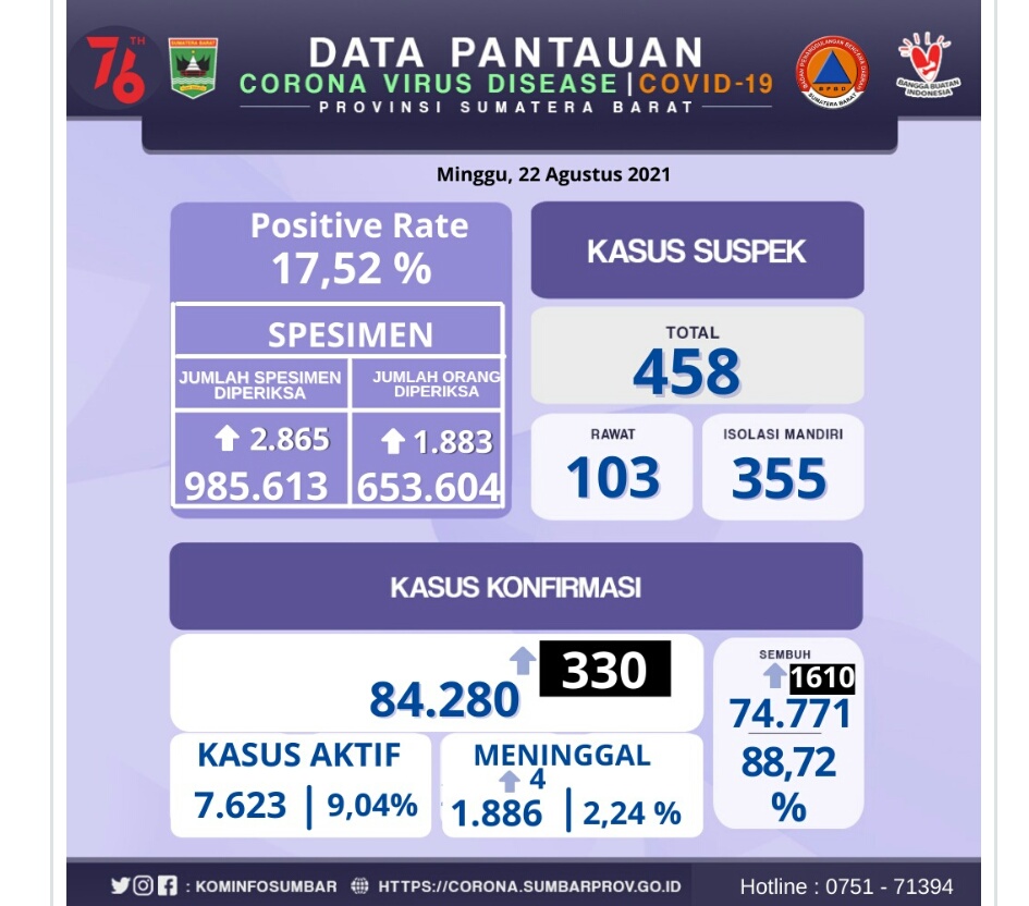 IWOSUMBAR.COM, PADANG – Satgas penangan Covid-19 Sumatera melaporkan sampai hari ini Minggu (22/8/2021) secara kamulatif warga sumbar terpapar virus corona telah berjumlah 84.280 orang.