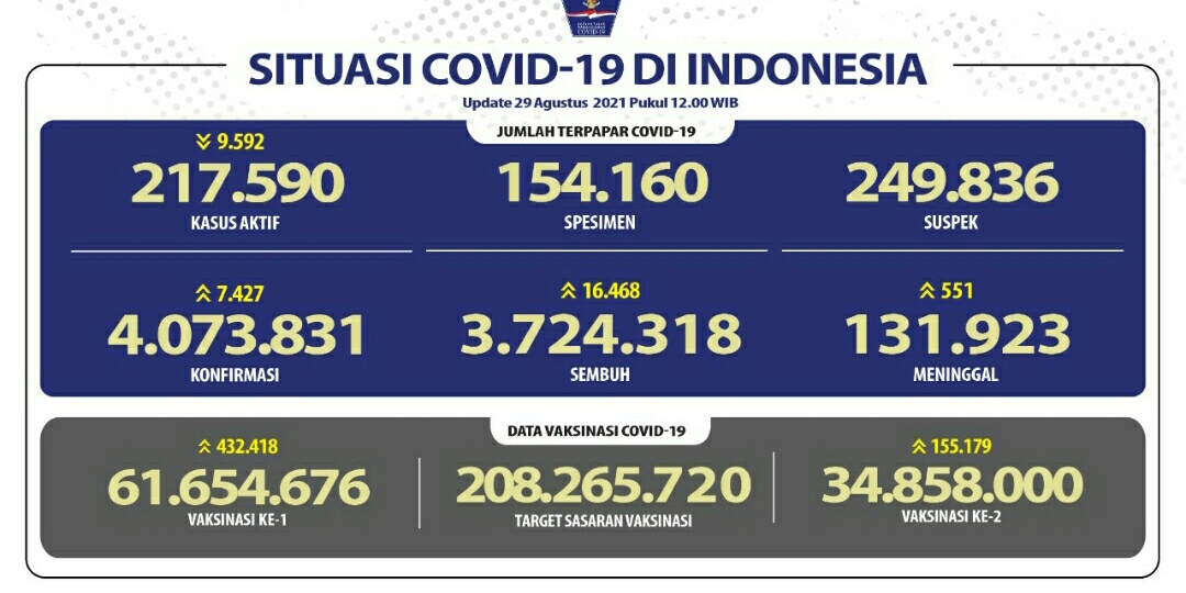 IWOSUMBAR.COM, JAKARTA – Perkembangan penanganan pandemi Covid-19 per 29 Agustus 2021 tercatat pertambahan pasien sembuh hari ini sebanyak 16.468 kasus