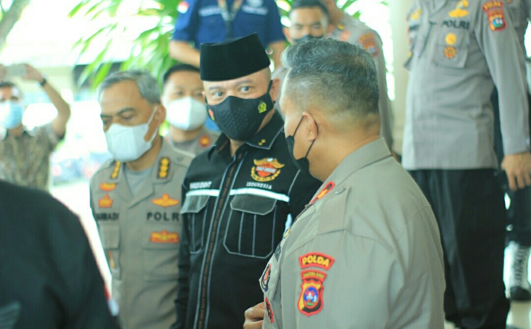 Kedatangan Kapolda Teddy Minahasa ke Sumbar dengan mengenakan pakaian Kemeja berwarna hitam liris dan berkopiah.