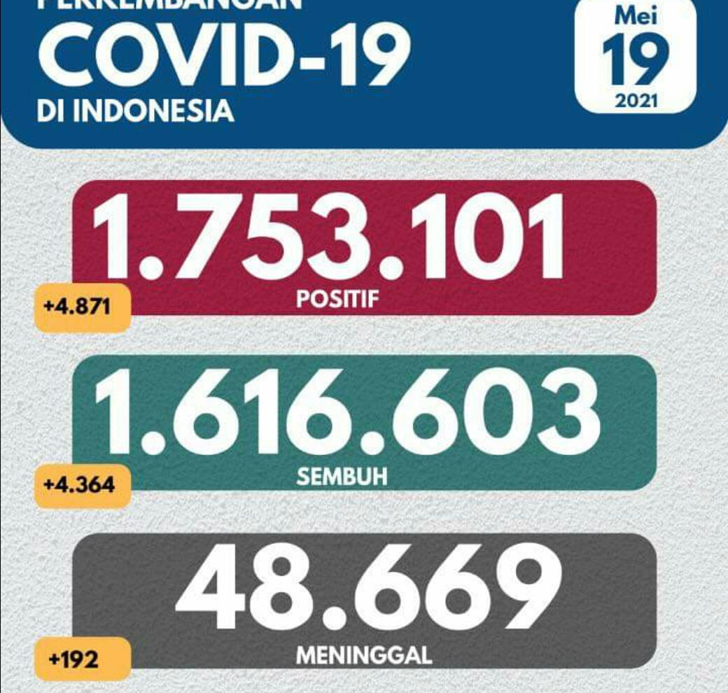 IWOSUMBAR.COM, JAKARTA – Perkembangan penanganan pandemi Covid-19 per 19 Mei 2021 tercatat pertambahan pasien sembuh hari ini sebanyak 4.364 kasus