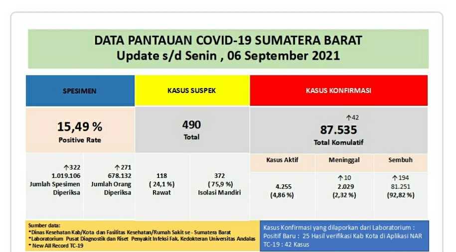 IWOSUMBAR.COM, PADANG – Satgas Covid Sumbar Jasman Rizal mencatat total sampai hari ini Senin (6/9/2021) Total Kamulatif telah berjumlah 87.535 orang warga Sumbar terinfeksi covid-19.