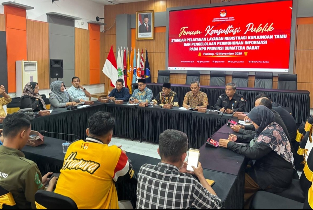 PADANG- Komisi Pemilihan Umum (KPU) Provinsi Sumatera Barat menggelar Forum Konsultasi Publik terkait penyusunan standar pelayanan registrasi kunjungan tamu serta pengelolaan permohonan informasi di Aula KPU Sumbar, Rabu (12/11/2025).