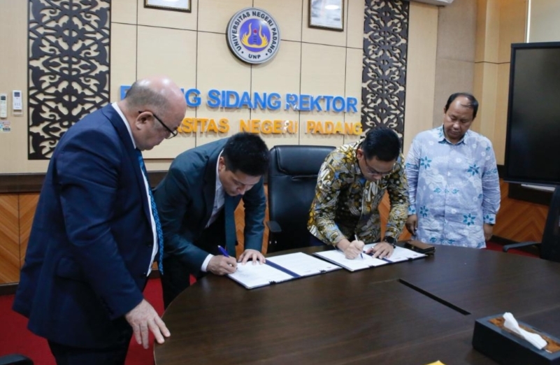 PADANG- Universitas Negeri Padang (UNP) kembali memperkuat jejaring globalnya dengan menjalin kemitraan strategis bersama Abai Kazakh National Pedagogical University (AKNPU), Kazakhstan. Kerja sama di bidang pendidikan dan teknologi melalui penandatanganan Nota Kesepahaman (MoU) (SDG 17) pada Jumat (21/11) di Ruang Sidang Rektor, Gedung Rektorat Lantai 4 UNP.