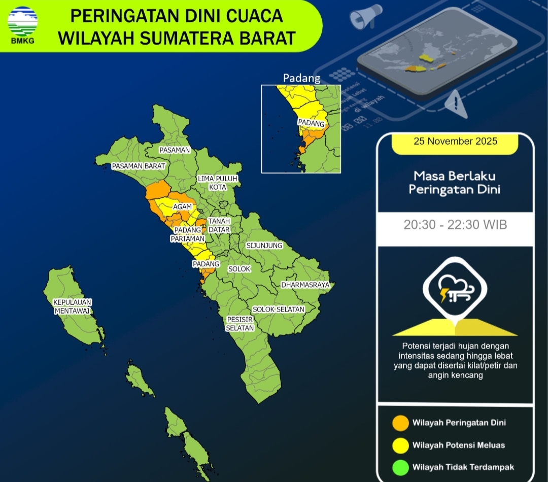PADANG- Badan Meteorologi, Klimatologi, dan Geofisika (BMKG) Sumatera Barat mengeluarkan update peringatan dini cuaca pada Selasa (25/11/2025) pukul 20.20 WIB. Sejumlah wilayah di Sumbar masih berpotensi diguyur hujan sedang hingga lebat yang dapat disertai kilat/petir dan angin kencang.