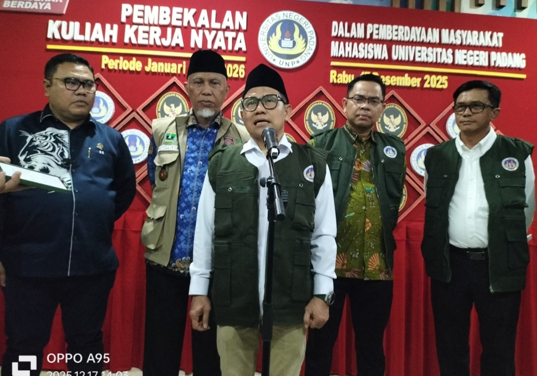 PADANG – Menteri Koordinator Pemberdayaan Masyarakat (Menko PM) Muhaimin Iskandar memberikan pembekalan sekaligus melepas ribuan mahasiswa Universitas Negeri Padang (UNP) peserta Kuliah Kerja Nyata (KKN), Selasa (17/12/2025), di Auditorium UNP.