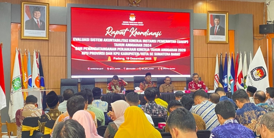 PADANG -Komisi Pemilihan Umum (KPU) Provinsi Sumatera Barat (Sumbar) menggelar Rapat Koordinasi Evaluasi Sistem Akuntabilitas Kinerja Instansi Pemerintah (SAKIP) Tahun Anggaran 2024 serta Penandatanganan Perjanjian Kinerja Tahun Anggaran 2026 KPU Provinsi dan KPU Kabupaten/Kota se-Sumatera Barat, di Aula KPU Sumbar, Padang, Kamis (19/12/2025).