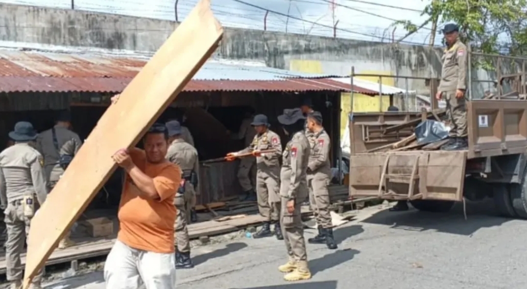 PADANG — Satuan Polisi Pamong Praja (Satpol PP) Kota Padang bongkar lima bangunan liar (Bangli) yang berdiri di atas fasilitas umum di kawasan Simpang Alai, Kelurahan Cupak Tangah, Kecamatan Pauh, Senin (12/1/2026).