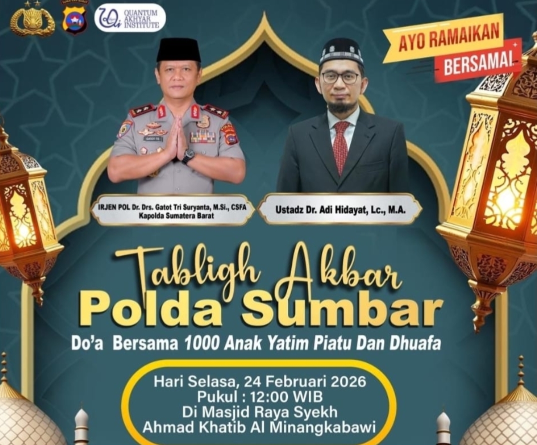PADANG – Bulan Ramadhan, Polda Sumatera Barat kembali menghadirkan kegiatan keagamaan Tabligh Akbar dan doa bersama 1.000 anak yatim, piatu, serta dhuafa. Kegiatan tersebut akan digelar pada Selasa, 24 Februari 2026, pukul 12.00 WIB di Masjid Raya Syekh Ahmad Khatib Al Minangkabawi, Kota Padang.