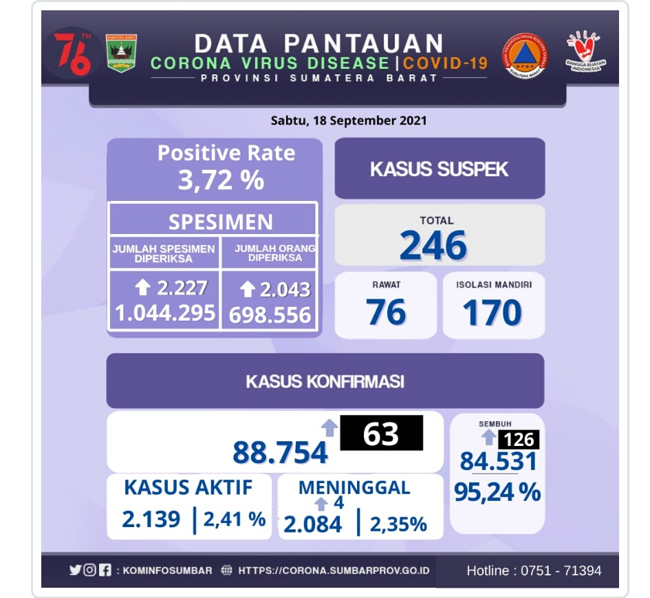 IWOSUMBAR.COM, PADANG – Satgas Covid Sumbar mencatat hari ini Sabtu (18/9/2021) terjadi penambahan kasus terkonfirmasi sebanyak 126 warga.