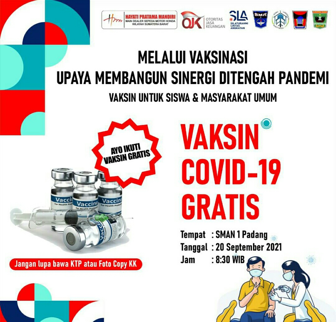 Ketua Pelaksana Silaturahmi Lintas Angkatan (SLA) SMA 1 Bukitinggi, Yofialdi mengatakan, bahwa kegiatan vaksinasi Gratis akan diadakan di SMA 1 Padang pada Senin 20 September 2021 mulai dari pukul 08.30 s/d Selesai