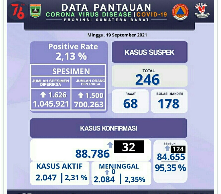 IWOSUMBAR.COM, PADANG – Satgas Covid 19 Mencatat total otal sampai hari ini Minggu (19/9/2021) terjadi penambahan kasus warga terkonfirmasi positif berjumlah 32 orang.