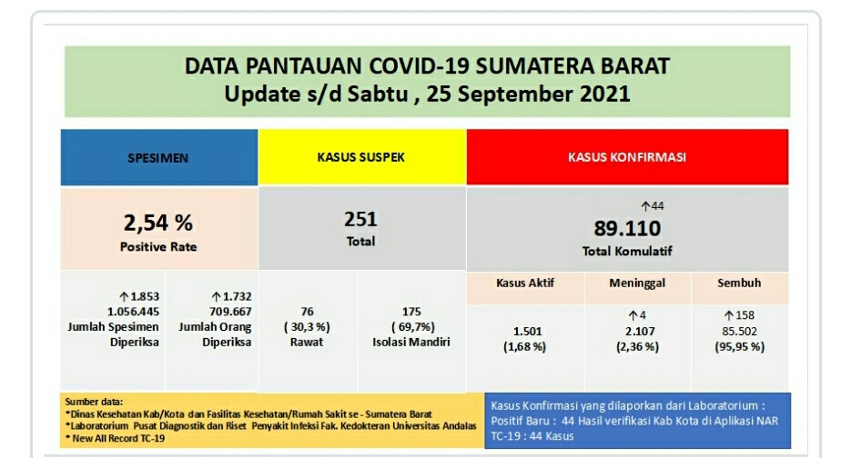 Dari Total komulatif kasus konfirmasi 89.110 orang, dengan rincian: Kasus Aktif 1.501 orang (1,68%). Meninggal dunia 2.107 orang (2,36%). Sembuh 85.502 orang (95,95%).