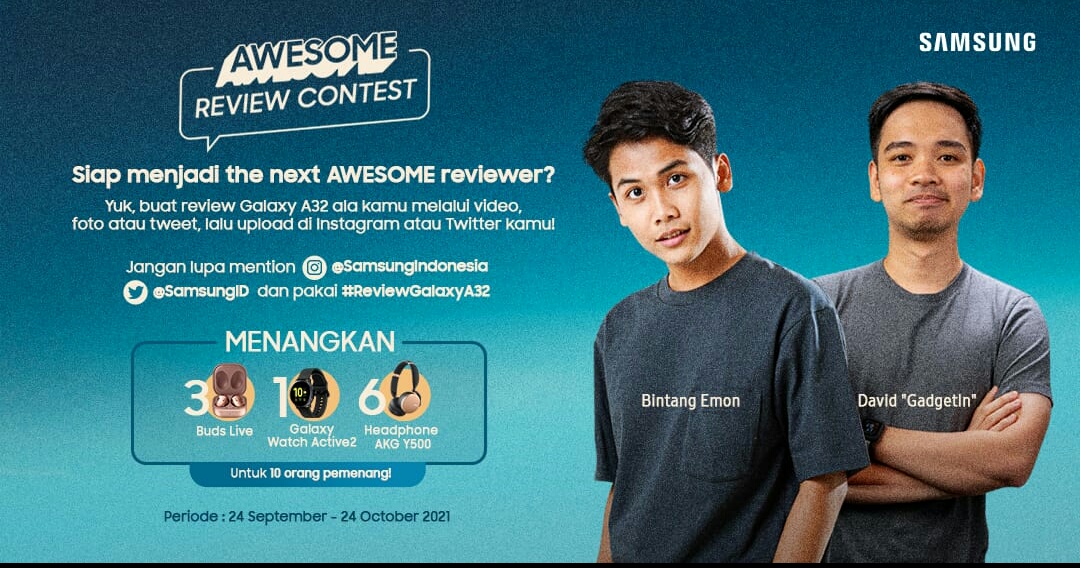 Melalui Awesome Review Contest, para generasi muda berkesempatan untuk memenangkan 3 unit Galaxy Buds Live, 1 unit Galaxy Watch Active2 dan 6 unit Headphone AKG Y500, serta diajak untuk mengenal lebih dalam smartphone yang mereka miliki dan menuangkan kreativitasnya dalam bentuk product review di media sosial. Dengan Galaxy A32, siapa pun dapat dengan mudah berkreasi sambil memanfaatkan Awesome Quad Camera 64MP, layar Super AMOLED 90Hz, dan tahan seharian berkat baterai besar 5.000 mAh.