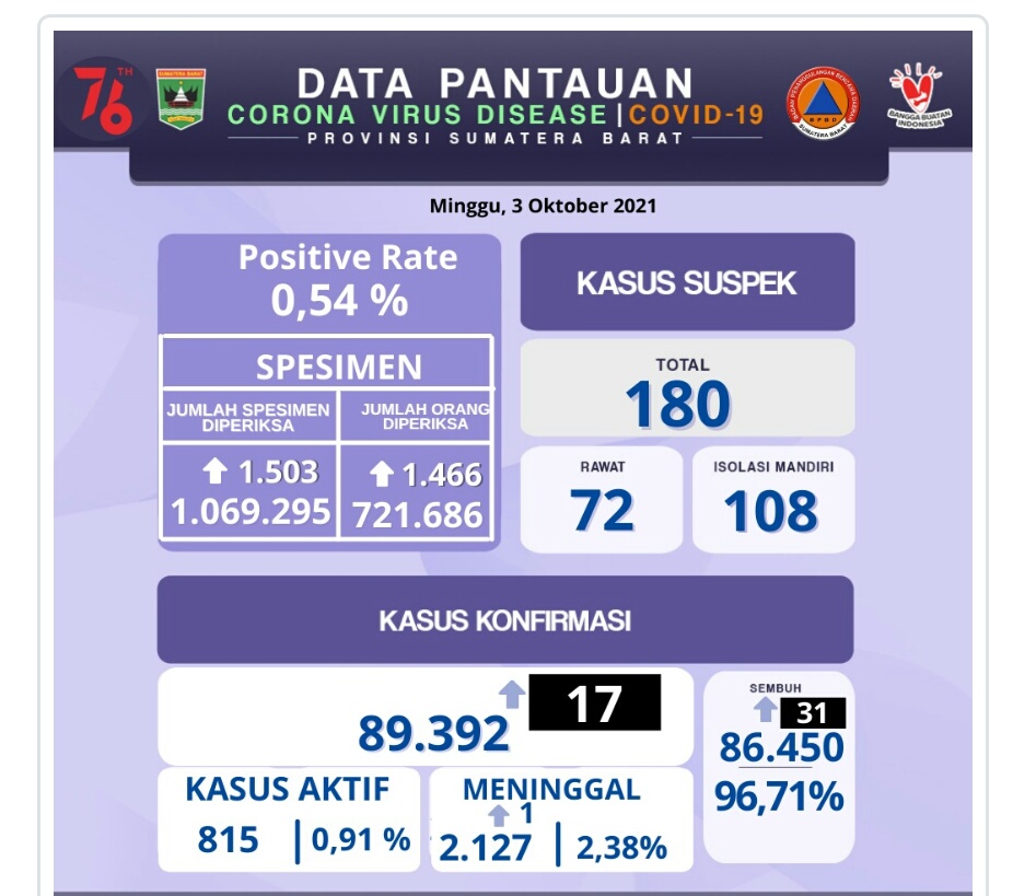 IWOSUMBAR.COM, PADANG – Total sampai hari ini Minggu tanggal 3 Oktober 2021 telah 89.392 orang warga Sumbar terinfeksi covid-19.