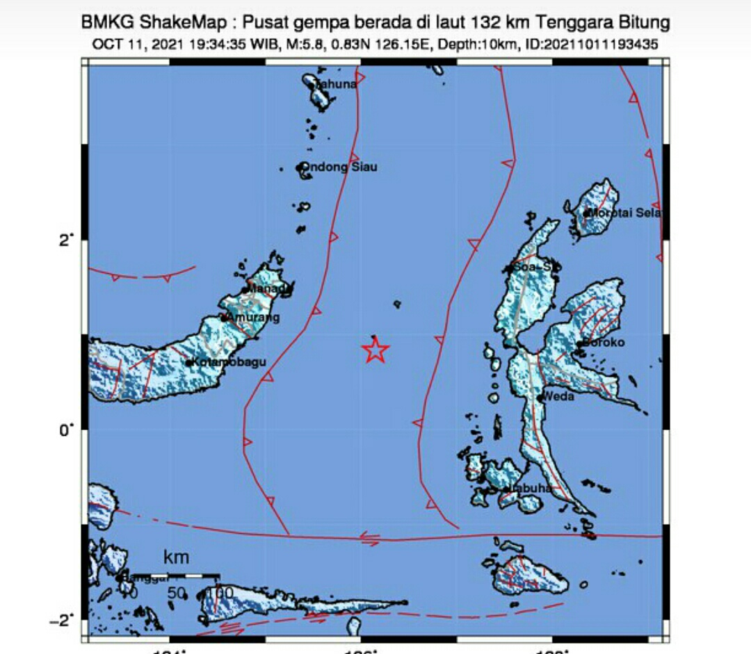 IWOSUMBAR.COM, JAKARTA – Gempa bumi magnitudo (M)5,8 picu guncangan dengan tingkat sedang yang dirasakan warga Kota Bitung, Provinsi Sulawesi Utara. Guncangan membuat warga setempat panik hingga keluar rumah. Peristiwa ini terjadi pada Senin malam (11/10), pukul 19.34 WIB.