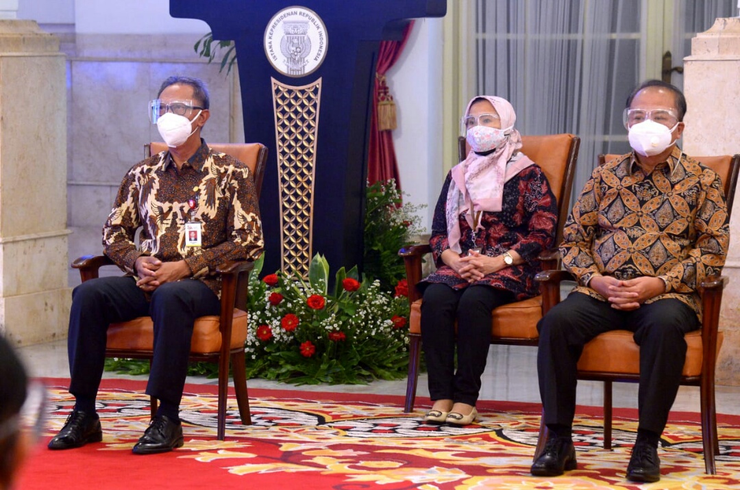 Turut hadir mendampingi Presiden dalam acara tersebut yaitu Menteri Koordinator Bidang Perekonomian Airlangga Hartarto, Sekretaris Kabinet Pramono Anung, dan Ketua Dewan Komisioner OJK Wimboh Santoso. (S-neg)