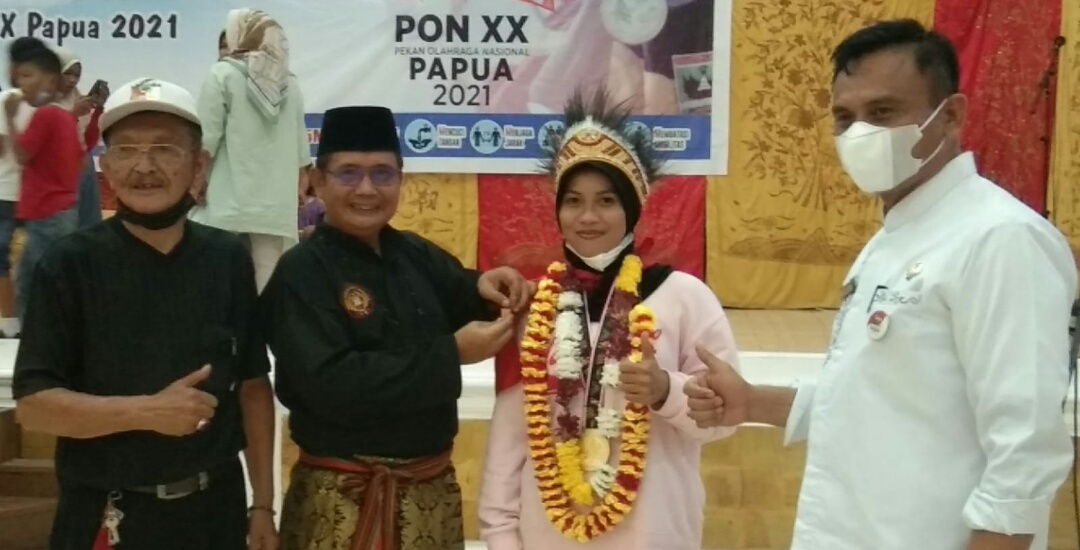 Iwosumbar.com, Padang- Buya Zulhardi Latif menyerahkan pin emas kepada Winda atlet IPSI Padang yang berhasil meraih medali emas PON Papua, pada Jumat (16/10) di Palanta Kota Padang.
