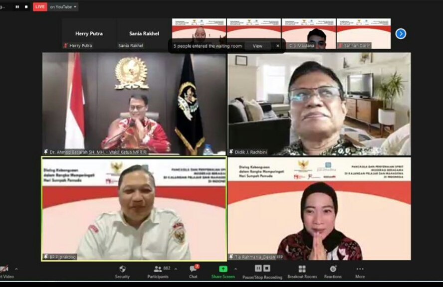 IWOSUMBAR.COM, JAKARTA -Badan Pembinaan Ideologi Pancasila (BPIP) dan Fakultas Falsafah dan Peradaban Universitas Paramadina yang didukung oleh Universitas Mahakarya Asia, Paramasophia menyelenggarakan Dialog Kebangsaan dalam Rangka Memperingati Hari Sumpah Pemuda yang bertajuk “Pancasila dan Penyemaian Spirit Moderasi Beragama di Kalangan Pelajar dan Mahasiswa” secara daring pada Hari Senin, 18 Oktober 2021 pukul 09:00 – 12:50 WIB.