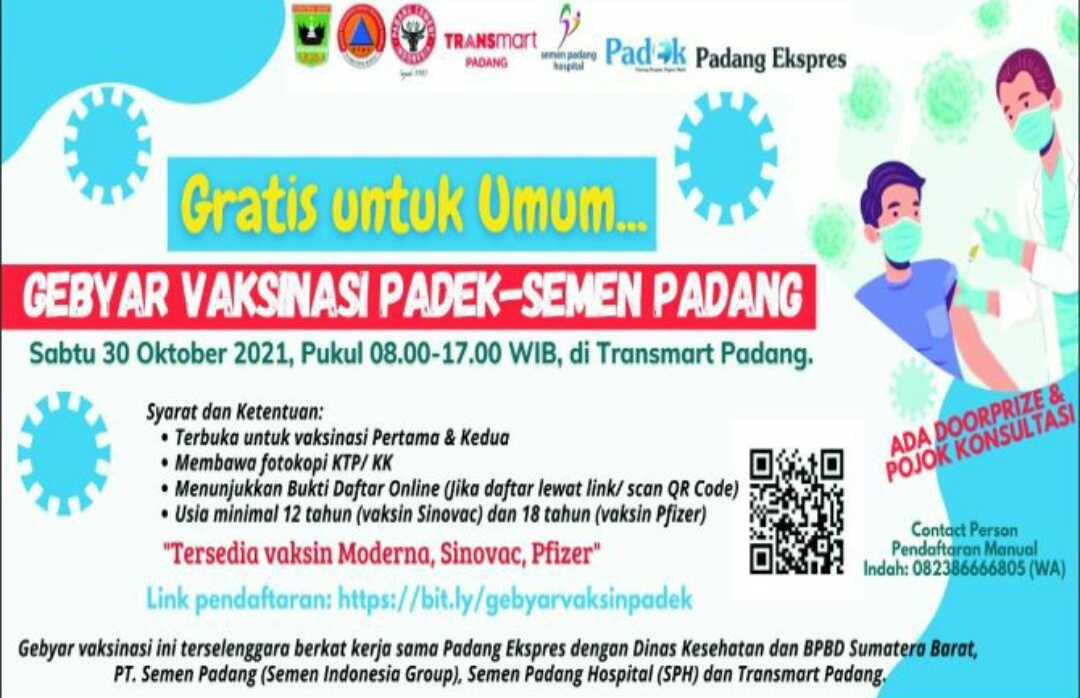 Kegiatan ini, digelar Pukul mulai 08.00-17.00 WIB, Sabtu 30 Oktober 2021 di Transmart Padang, bertajuk” “Gebyar Vaksinasi Padek-Semen Padang 2021”.