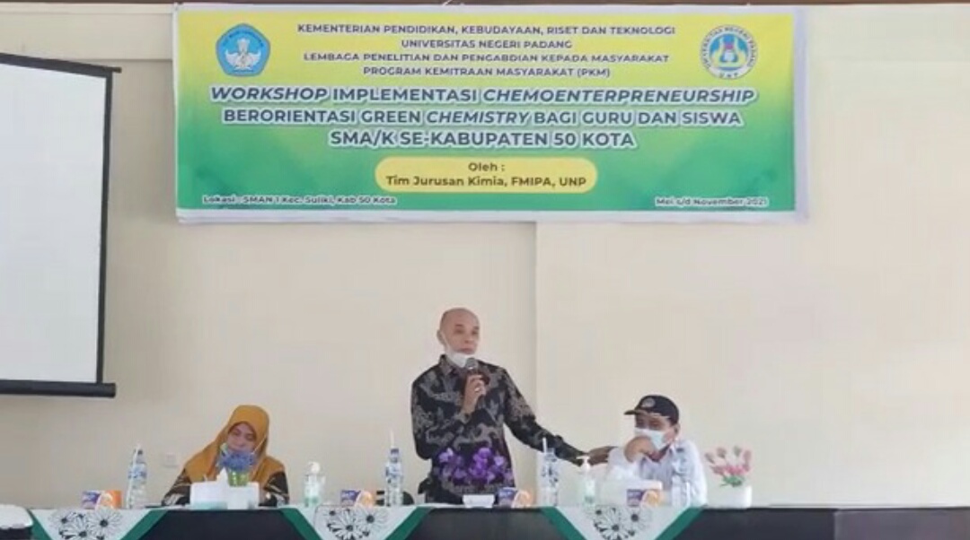 “Untuk itu kami melaksanakan kegiatan workshop/pelatihan Chemoenterpreneurship Berorientasi Green Chemistry bagi Guru dan Siswa SMA/K Se-Kabupaten 50 Kota, khususnya guru dan siswa SMA Negeri 1 Kec. Suliki yang merupakan salah satu dari 10 sekolah penggerak yang ada di Sumatera Barat untuk meningkatkan minat wirausaha para guru dan siswa tersebut.,” jelasnya.