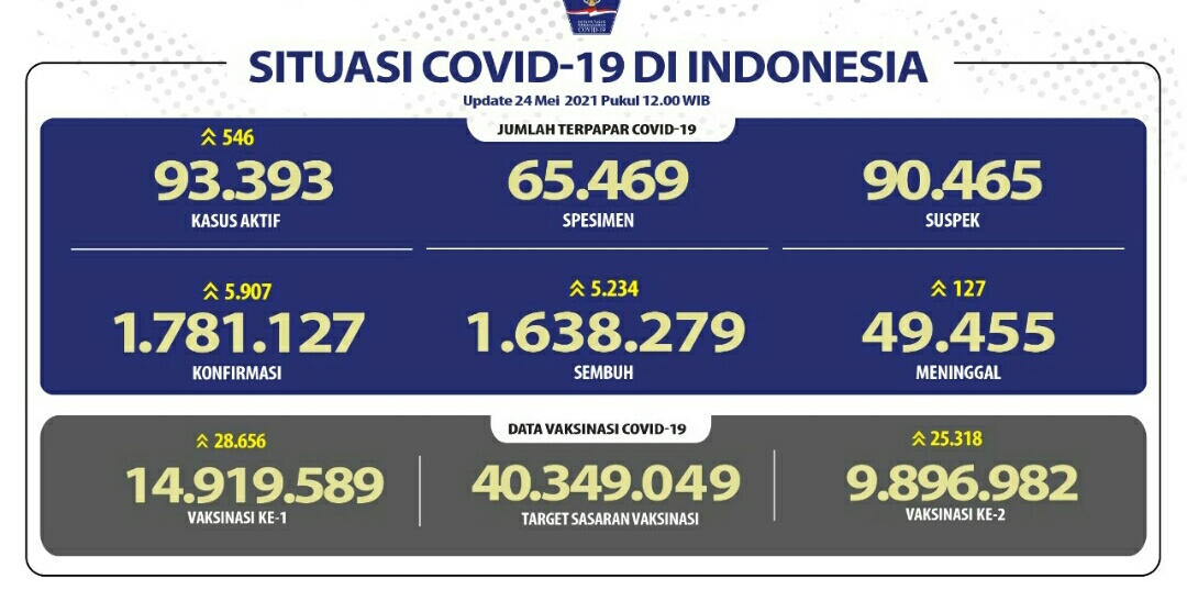 IWOSUMBAR.COM, JAKARTA – Perkembangan penanganan pandemi Covid-19 per 24 Mei 2021 tercatat pertambahan pasien sembuh hari ini sebanyak 5.234 kasus