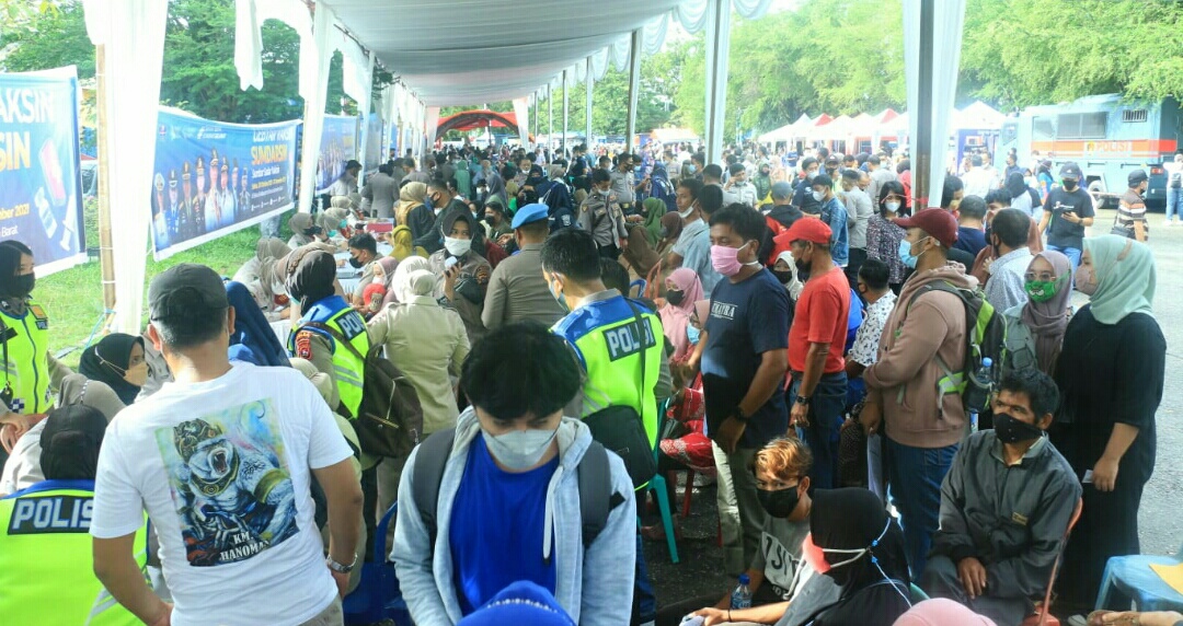 IWOSUMBAR.COM, PADANG- Gelaran vaksin massal Polda Sumbar diserbu masyarakat kota Padang. Terlihat dari banyaknya warga yang telah melakukan pendaftaran di depan stadion GOR H Agus Salim Padang, Sabtu (30/10)
