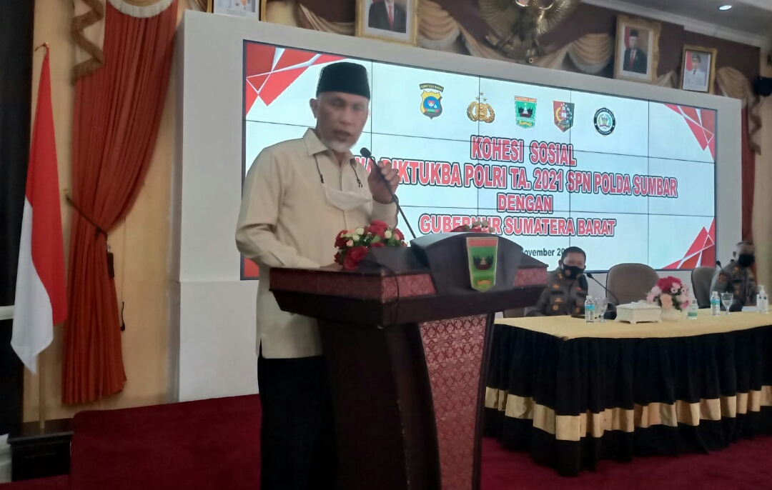IWOSUMBAR.COM, PADANG – Gubernur Mahyeldi memberikan motivasi tentang pentingnya merawat persatuan bangsa pada acara Kohesi Sosial Siswa Pendidikan Pembentukan Bintara (Diktukba) Polri tahun 2021 SPN POLDA Sumbar Padang, di Auditorium Gubernuran, Minggu (7/11/2021).